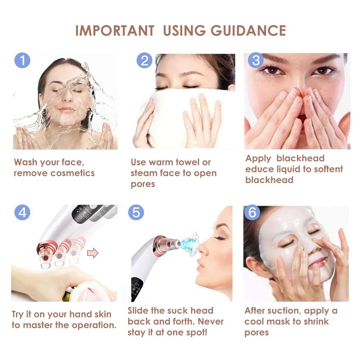 - 💖 SAFE & SKIN-FRIENDLY DESIGN ✔ Our facial vacuum pore extractor is designed with smoth suction heads,it is gental and effective to remove the blackheads.Make sure to hot compress your skin for 5 minutes to open the pore before use,you can see the effection clearly, application in regular time will bring healthy and flawless skin to you.