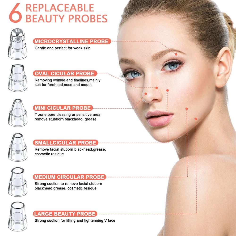 - 💖 MULTI-FUNCTIONAL BEAUTY DEVICE ✔ Our facial beauty tool have 6 replaceable and delicate suction heads for professional facial care, it allow you to remove the grease/blackheads without limitation,reduce comedones and oil,lessen the finelines, lift the V-face, shrink pores and facilitate the metabolism.The microcrystalline probe is very gentle to remove the rough old skin and aged horiness,promote the blood circulation,you can apply this probe to massage the tied eyes after power off.